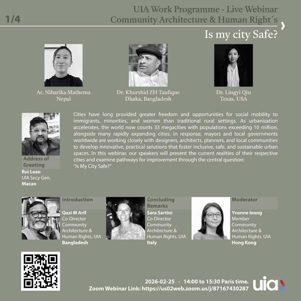 The UIA Community Architecture & Human Rights Work Programme invites you to join an international webinar exploring one of today’s most urgent urban questions: Is my city safe?